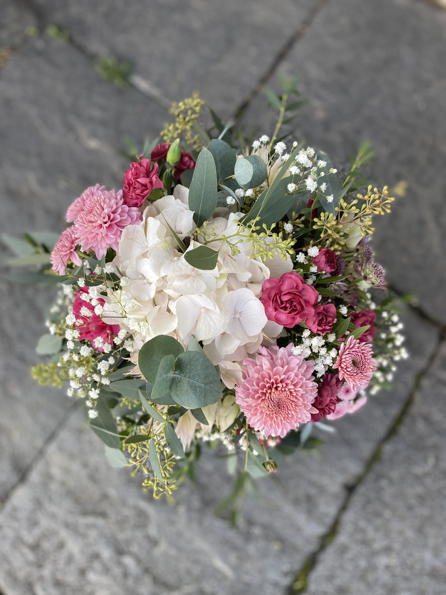 Die Arrangements werden saisonal mit den aktuell blühenden Schnittblumenblumen gestaltet. Daher können wir die Sträusse und Gestecke nicht immer genau so wie auf den Bildern umsetzen, sondern passen die Werkstücke der Jahreszeit an.